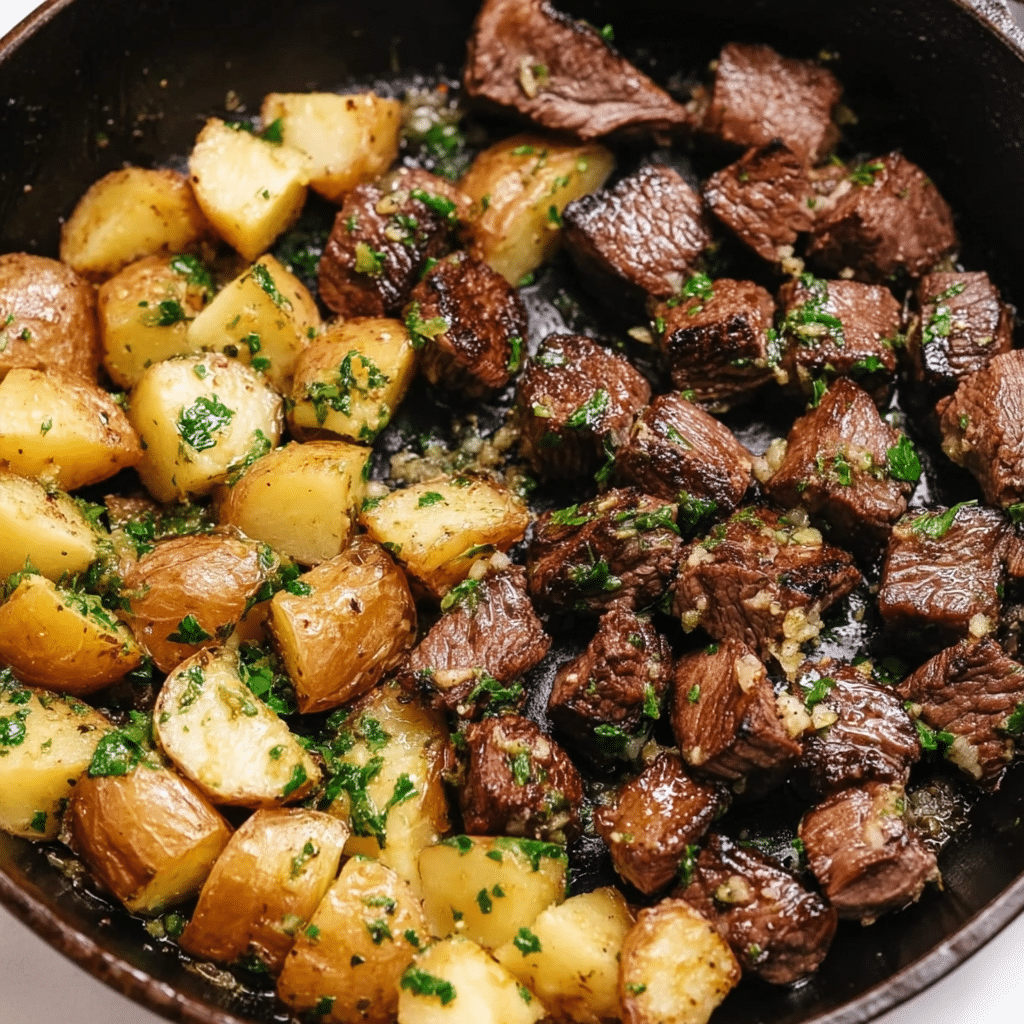This garlic butter steak bites and potatoes recipe is an easy one-pan skillet dinner with tender seared steak, crispy potatoes, and rich garlic herb butter.